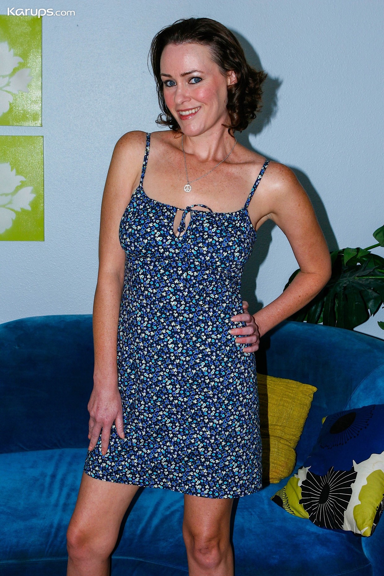 La mamma puttana si spoglia sul divano blu