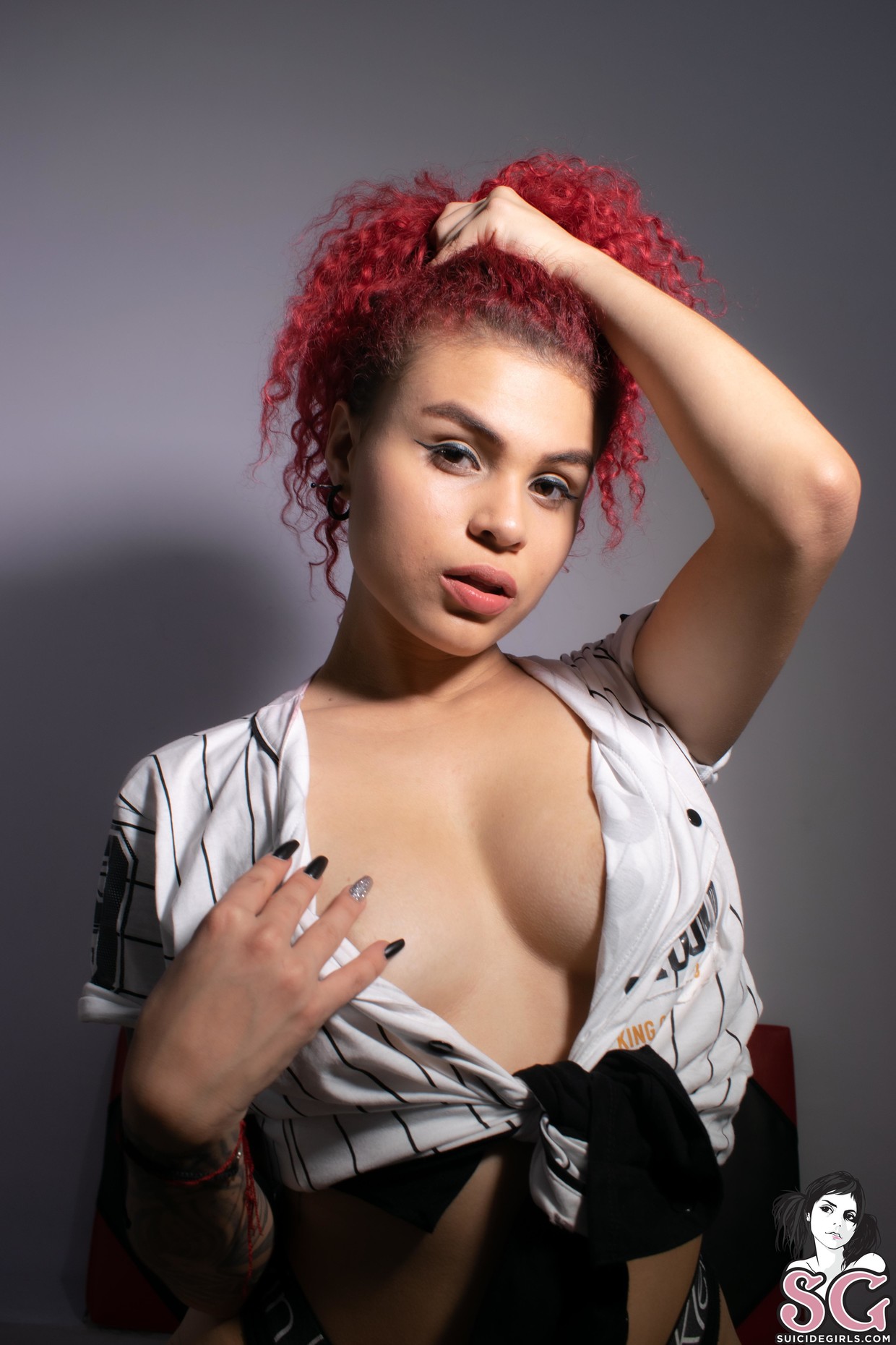 Niki, una sexy ragazza tatuata dai capelli rossi ricci, si spoglia nuda