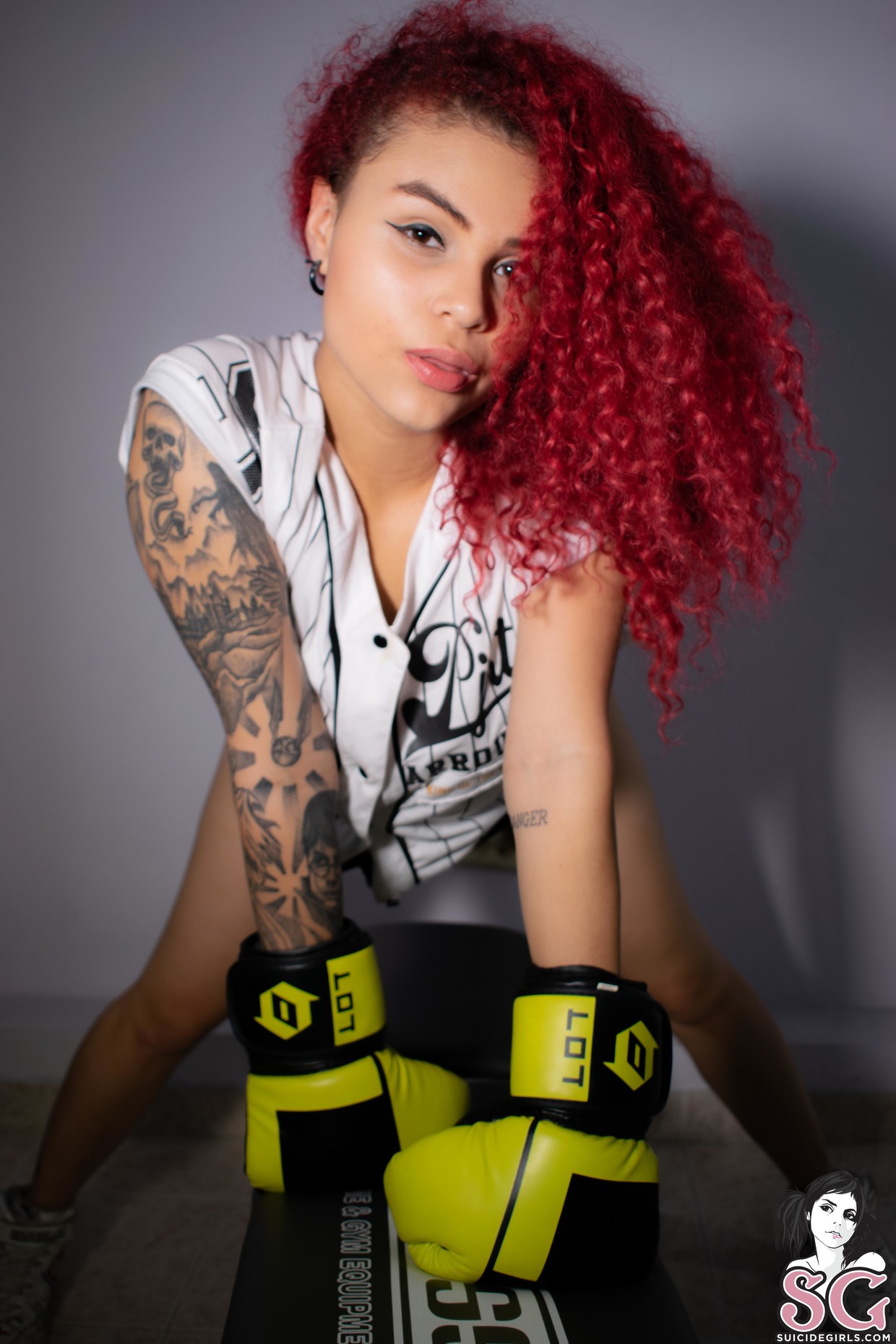 Niki, una sexy ragazza tatuata dai capelli rossi ricci, si spoglia nuda