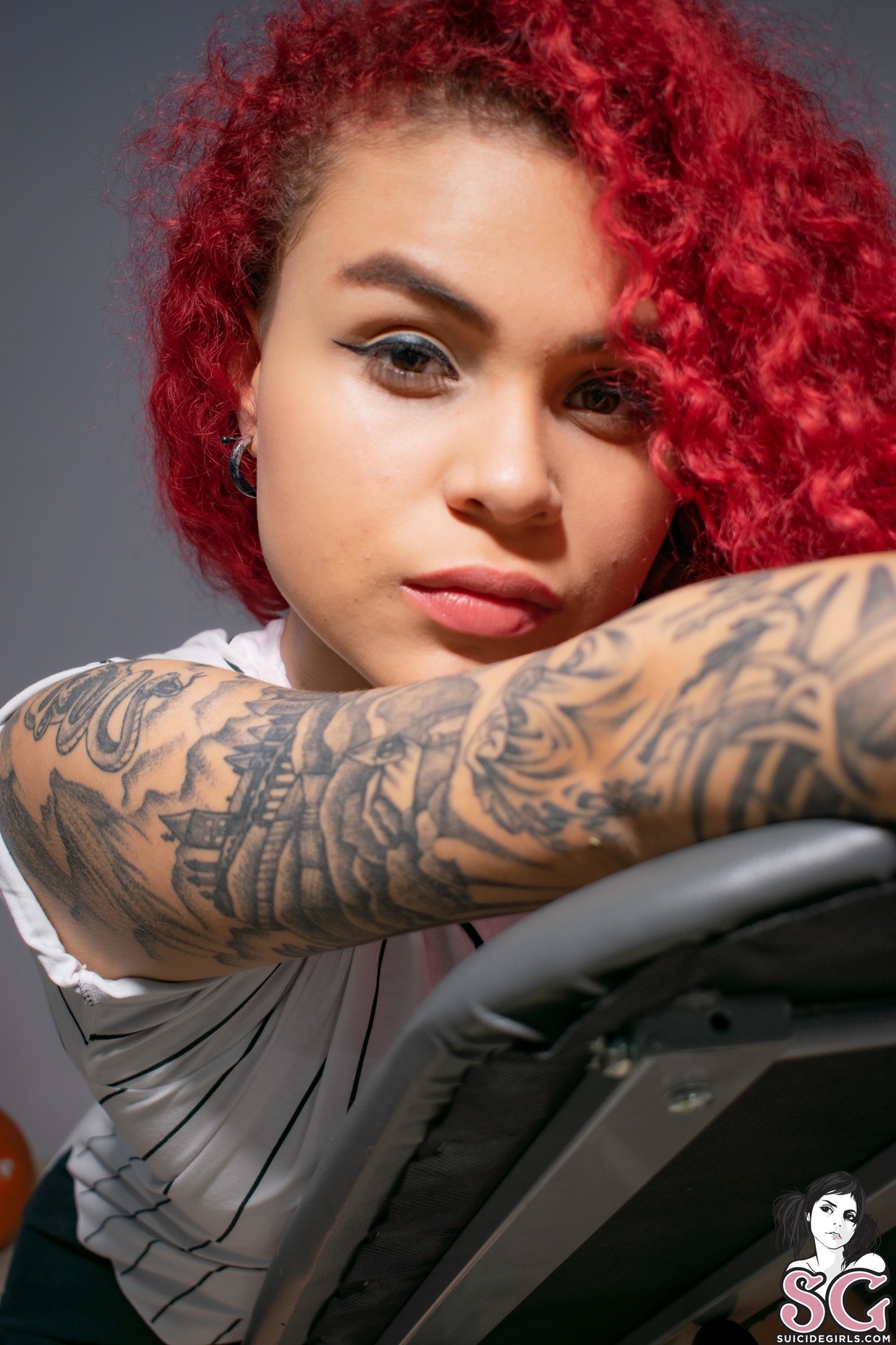 Niki, una sexy ragazza tatuata dai capelli rossi ricci, si spoglia nuda