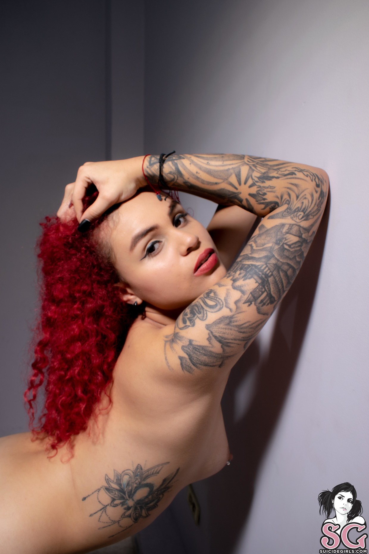 Niki, una sexy ragazza tatuata dai capelli rossi ricci, si spoglia nuda