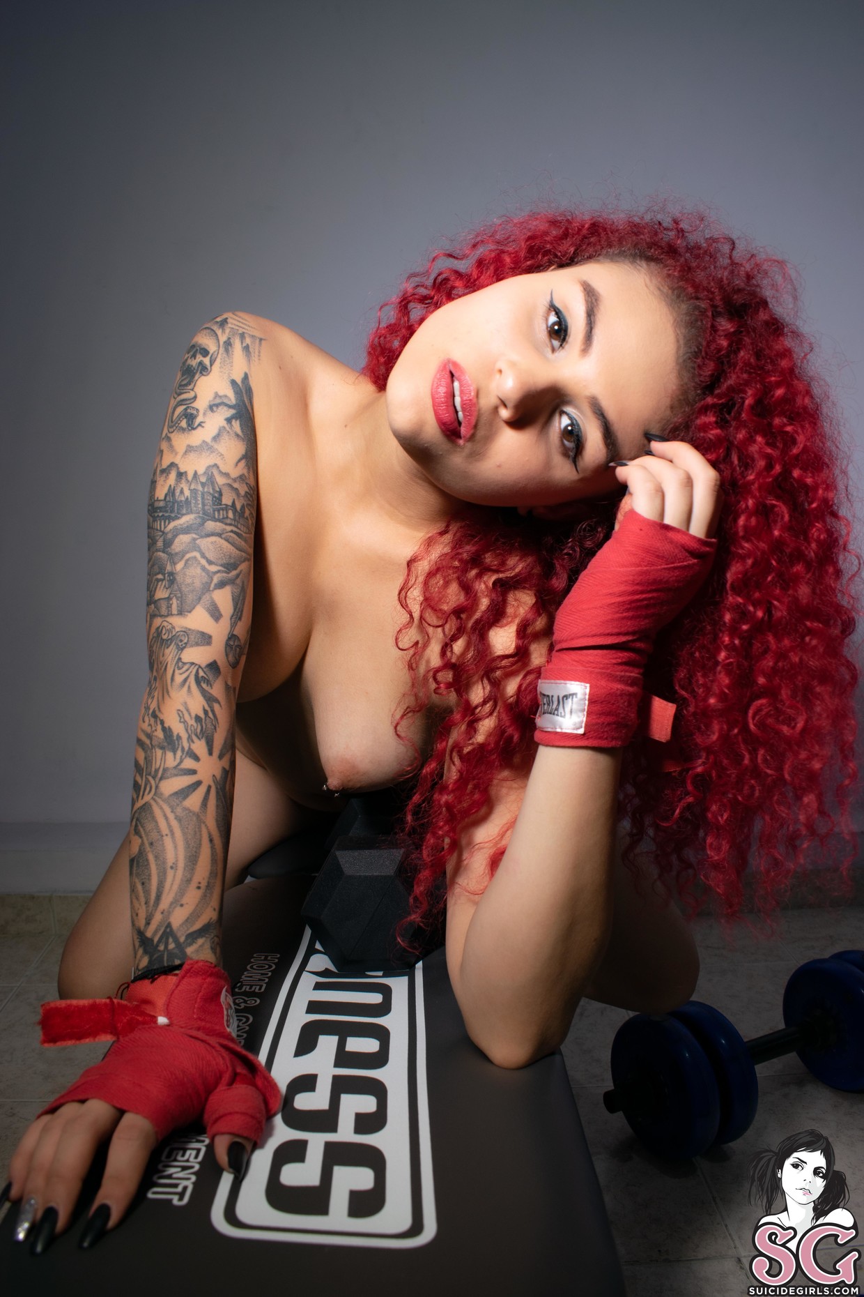 Niki, una sexy ragazza tatuata dai capelli rossi ricci, si spoglia nuda