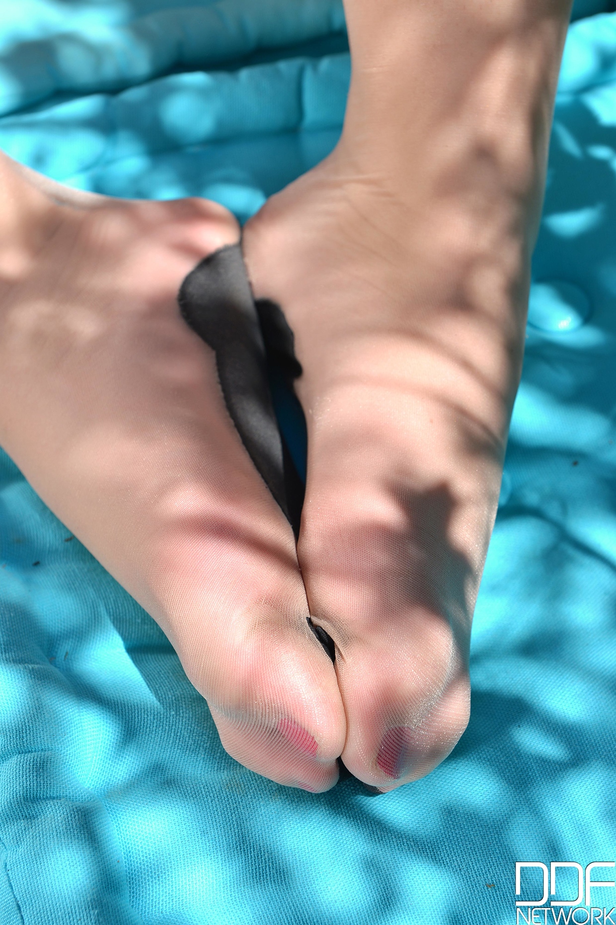 Ragazza dai capelli neri con grandi tette che prende il sole in calze e lingerie